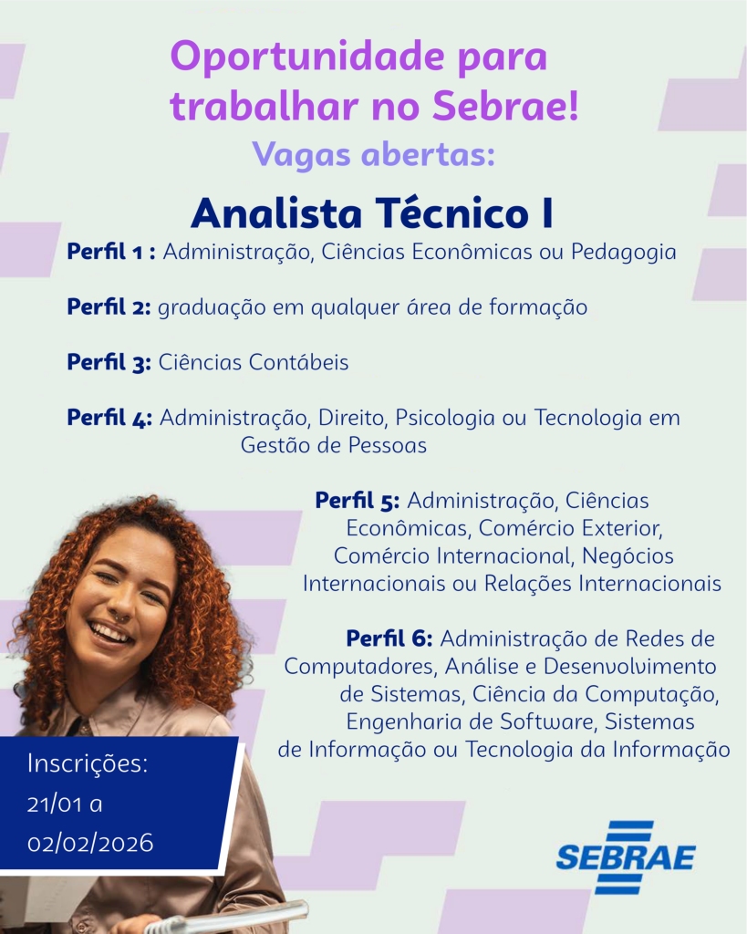 O Serviço de Apoio às Micro e Pequenas Empresas no Amapá (Sebrae) abriu o Processo Seletivo SEBRAE/AP nº 01/2026, executado pela Fundação de Apoio à Pesquisa, Tecnologia e Cultura (FAPETEC). As inscrições iniciam no dia 21 de janeiro e seguem até 2 de fevereiro. O processo tem como objetivo selecionar profissionais para o cargo de Analista Técnico I, com a oferta de 10 vagas. Para participar, os interessados devem realizar a inscrição por meio do cadastro eletrônico disponível no site www.fapetec.org.