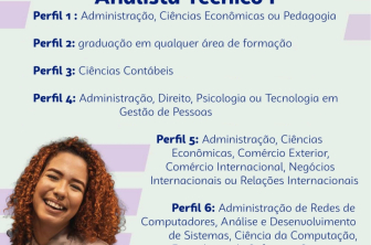 O Processo Seletivo oferece vagas para o cargo de Analista Técnico I, destinadas a candidatos com formação em diferentes áreas. Podem participar profissionais formados em Administração, Ciências Econômicas ou Pedagogia; Ciências Contábeis; Direito, Psicologia ou Tecnologia em Gestão de Pessoas; Comércio Exterior, Comércio Internacional, Negócios Internacionais ou Relações Internacionais. Também podem concorrer candidatos da área de tecnologia, como Administração de Redes de Computadores, Análise e Desenvolvimento de Sistemas, Ciência da Computação, Engenharia de Software, Sistemas de Informação ou Tecnologia da Informação. Além disso, há vagas destinadas a profissionais com graduação em qualquer área de formação, conforme os perfis previstos no edital.